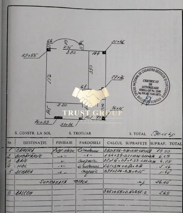 Dispune de o suprafata totala de 40mp, este decomandata si compartimentata astfel: camera, baie, spatii de depozitare, bucatarie si balcon.