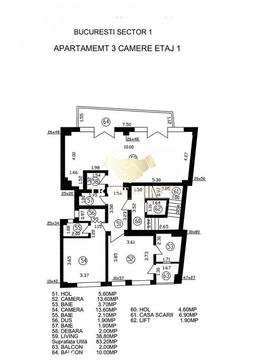 Dispune de o suprafata utila de 100 mp, este decomandat si compartimentat astfel: living, bucatarie, doua dormitoare, doua bai, hol si spatiii de depozitare si o terasa