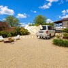 Curte frontală amenajată cu pietriș, plante ornamentale și trandafiri