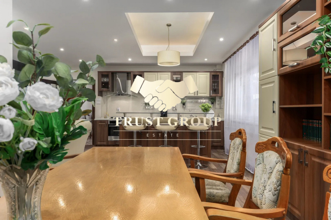 Parter (138 mp): living principal de 51 mp, bucătărie complet utilată, baie, birou, debara, hol amplu și un al doilea living de 44 mp, dotat cu șemineu, bar și zonă de relaxare