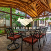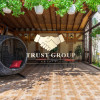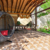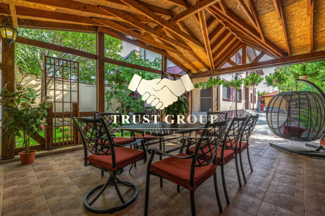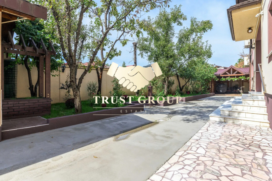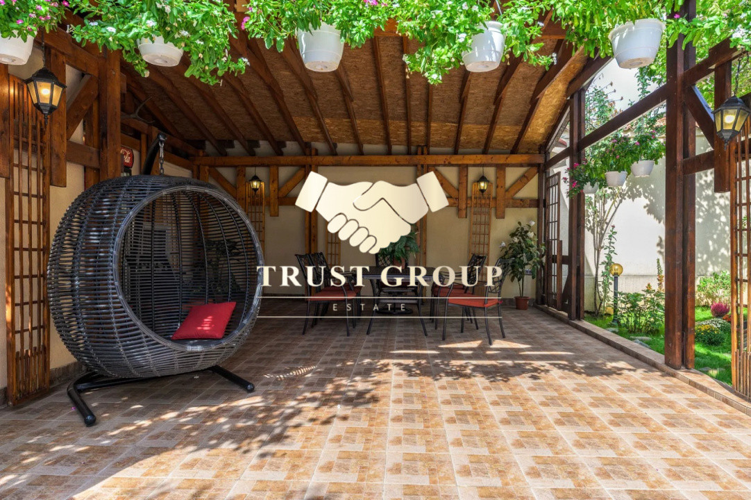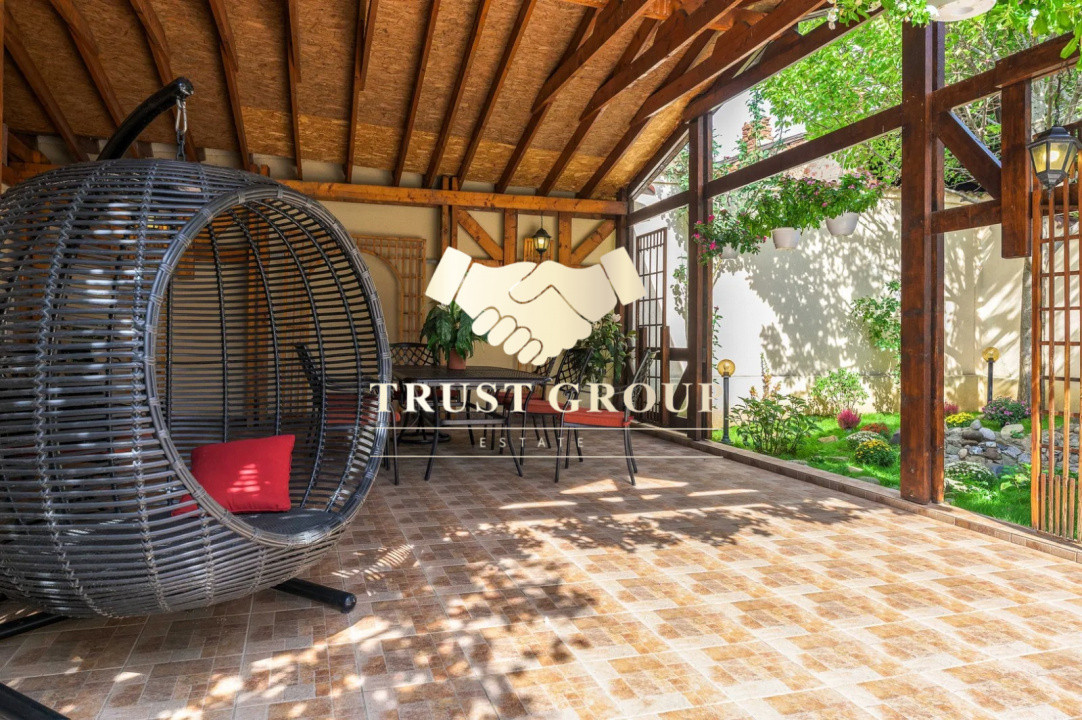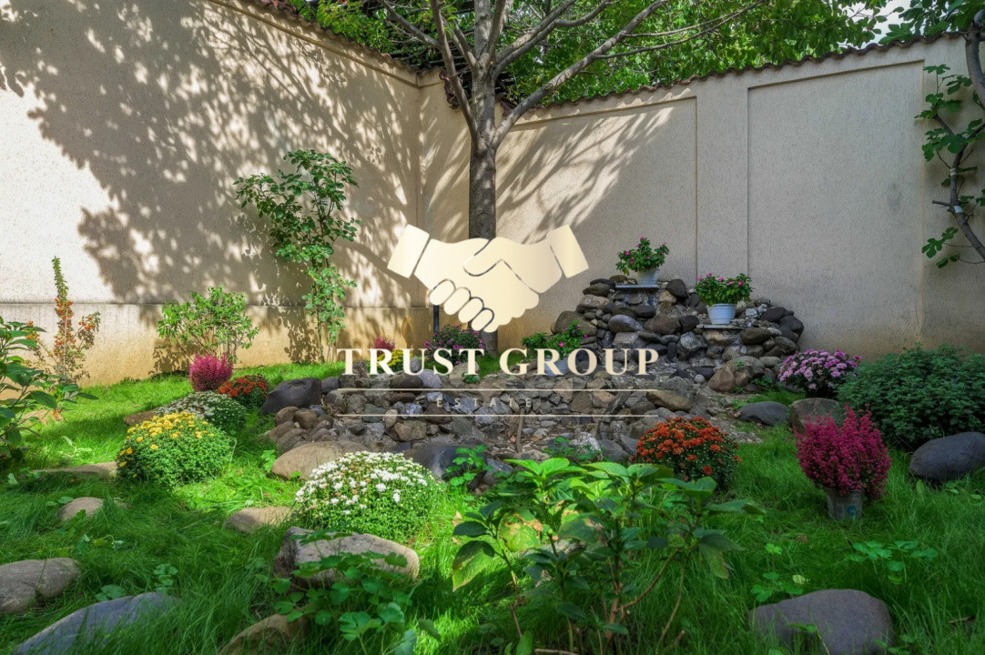 Grădina este matură și atent amenajată, incluzând un foișor din lemn de circa 50 mp, zonă de barbeque, iaz decorativ cu cascadă, fântână arteziană, gazon, arbori ornamentali, trandafiri și magnolii. Proprietatea dispune de garaj de 35 mp cu acces direct din stradă și posibilitate de parcare pentru 4–5 autoturisme în curte.